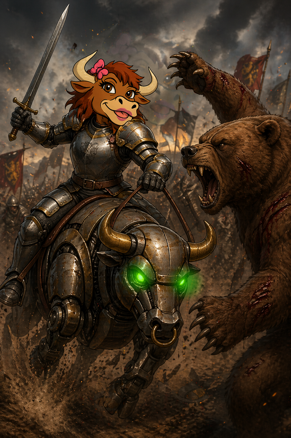 Bulla see Bull run. Bulla follow. Chart go up. Bulla lead herd.
